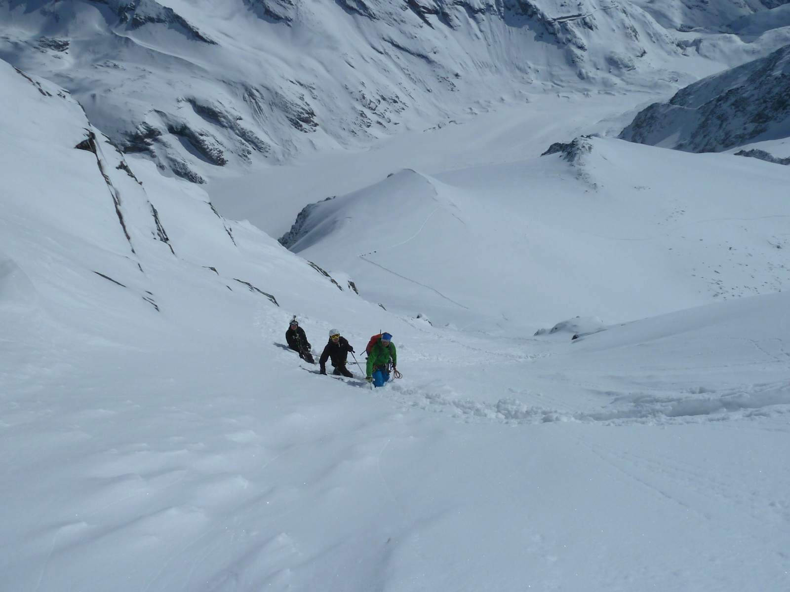 HINWEIS: Durch die Ausaperung der oberen Flanke des Ködnitzkeeses ist es nicht mehr möglich, durchgängig mit Ski auf das Kleinglocknerkees aufzusteigen – eine Felsstufe mit etwas exponierter Kletterei (und ohne Sicherungsmöglichkeiten) ist dort entstanden. Deswegen ist man jetzt schneller und vor allem sicherer, wenn man über den Sommerweg (versicherter Klettersteig) zur Adlersruhe aufsteigt. Auch für die Abfahrt lohnt es sich nicht, die Ski mit hinauf zu schleppen, da man nun die Höhe zu spüren bekommt und die Abfahrt (je nachdem wie hoch man die Ski trägt) nur kurz und durch die vorhandenen Fußspuren meist sehr ruppig ist. Eine Steilwandeinfahrt (ca. 40-45°) ist gleich neben der Adlersruhe möglich, bleibt aber versierten Skibergsteigern vorbehalten!!!