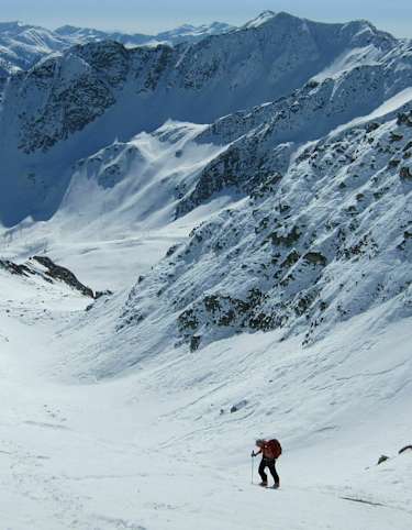 Bei der Abfahrt wählt man entweder die Aufstiegsroute, um auf der Stüdlhütte deponiertes Material wieder mitzunehmen bzw. um eine Rast einzulegen. Oder man fährt direkt ab, sprich unter den Blauen Köpfen vorbei, wobei man ab den „Viehböden“ wieder entlang der Aufstiegsspur fahren kann. Alternativ kann man unter der „Langen Wand“ schöne Hänge finden, die allerdings bis zu 40° steil sind!