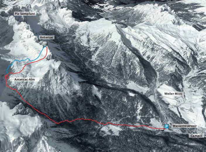 Beim Parkplatz steigt man über den Zaun und geht über sanfte Wiesen zu einer Forststraße aufwärts. Dieser folgt man ca. 200 m, wobei man leicht absteigt. Man geht rechts über einen relativ steilen Weg durch den Wald zu einer Forststraße, die in einen Kessel führt. Der Weg führt aufwärts zu einer Hochebene, von der man die Antersasc-Alm sehen kann. Man steigt rechts gegen Süden hin über einen relativ steilen Hang an und geht in der Nähe einer schönen Zirbelkiefer vorbei bis zu einem Hang, den man gegen Norden hin im leichten Abstieg quert. Man sieht nun den Gipfel des Antersasc; über Hänge und ebene Flächen gelangt man unter die Nordwand des Berges. Der Weiterweg führt nach links und am Rande des Grates hinauf zum Gipfel.