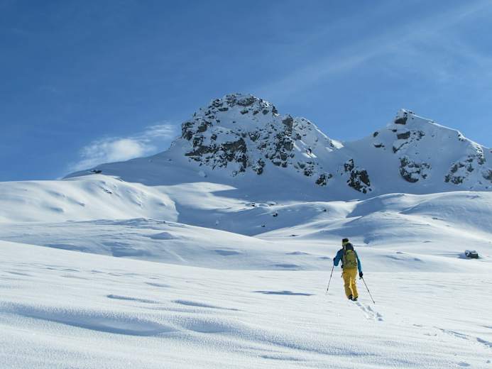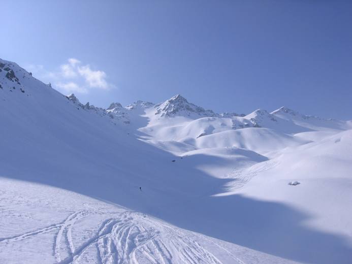 Ab der Talstation Schafberg II wird die Spur flacher und man gelangt mühelos an der Kessl-Hütte und der Gargellenalpe vorbei in ein sanftes Bachbett, welchem man nach Westen zum St.Antönierjoch (2.371 m) folgt. Der Hang ist nicht allzu steil, dennoch sollte auf eine gute Spuranlage geachtet werden. Meist ist diese aber schon vorhanden.