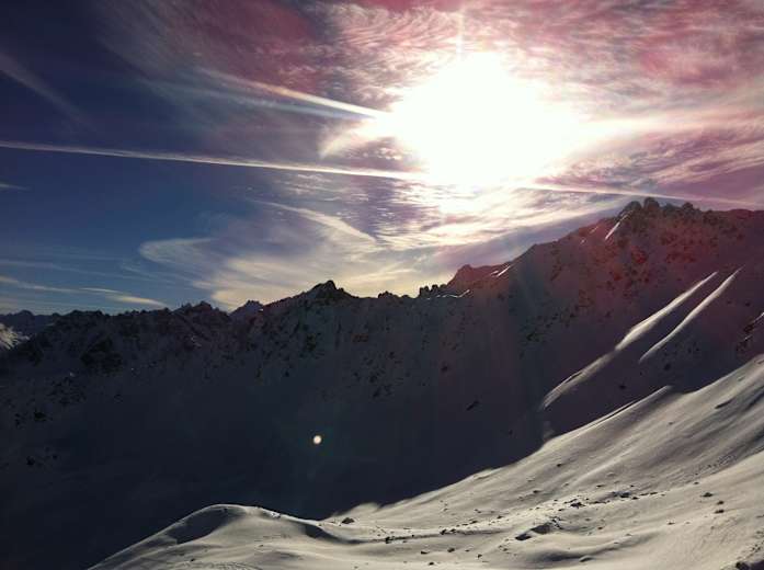 Wer mit der Schafbergbahn und danach der Kristallbahn hinauffährt, nimmt die Piste Tälli für eine kurze Abfahrt auf etwa 2.150 m Höhe. Von dort wird der Anstieg zum St.Antönier Joch von Südwest vorgenommen.