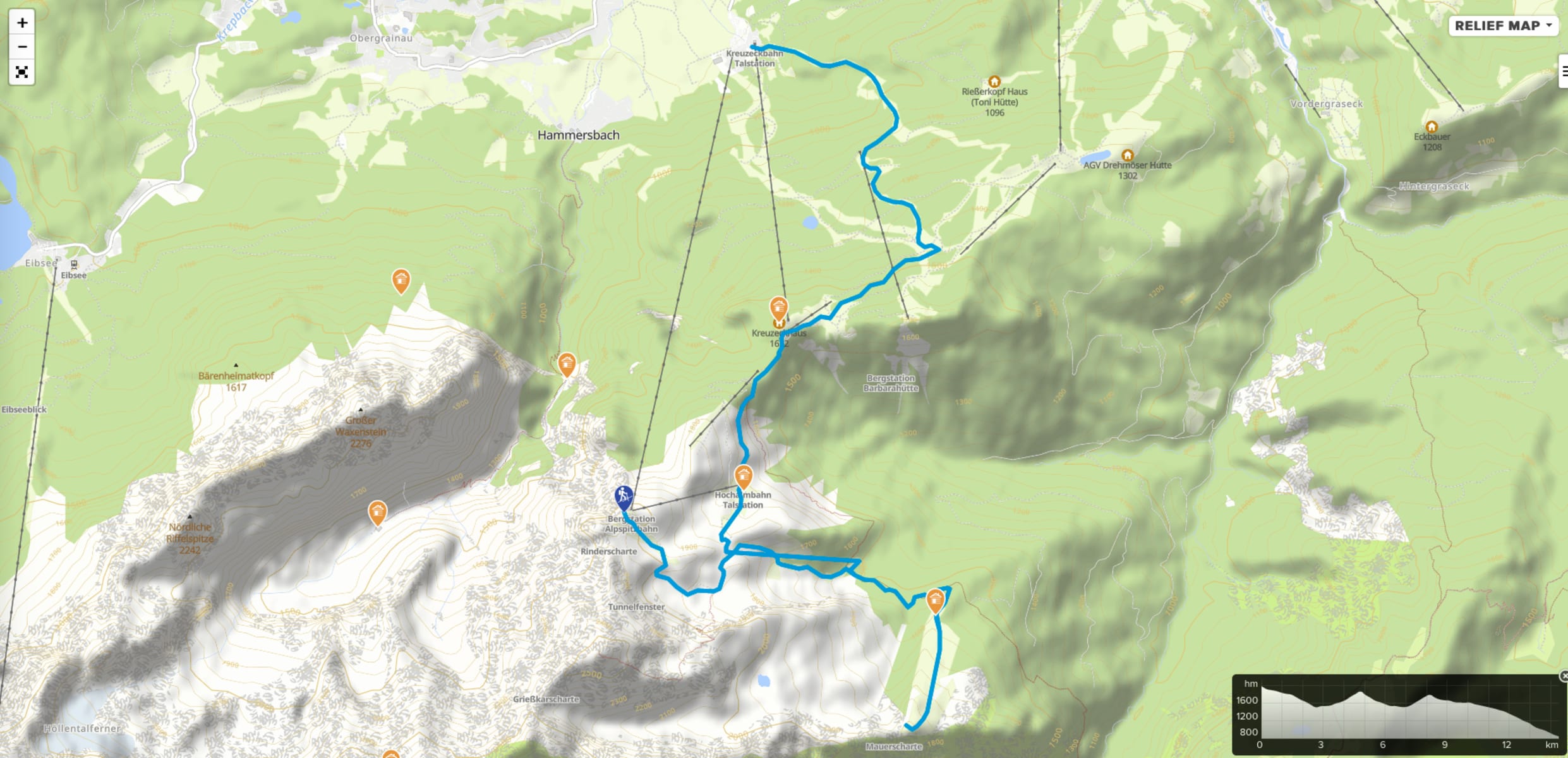 Nach der Auffahrt mit der Alpspitzbahn folgt man der Piste bis kurz vor die Talstation des Bernadeinliftes. Am rechten Rand der Piste findet man ein Hinweisschild für die Tour. Anschließend geht man auf dem Sommerweg ziemlich flach in Richtung Stuibenhütte.