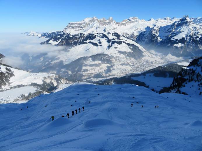 Abwechslungsreiche Skitour in den Zentralschweizer Alpen an der Grenze von Obwalden und Nidwalden. Das Alpelenhörnli (2.024 m) bietet einen perfekt geneigten Nordhang und beeindruckt durch ein traumhaftes Bergpanorama. Auch für Anfänger geeignet.
