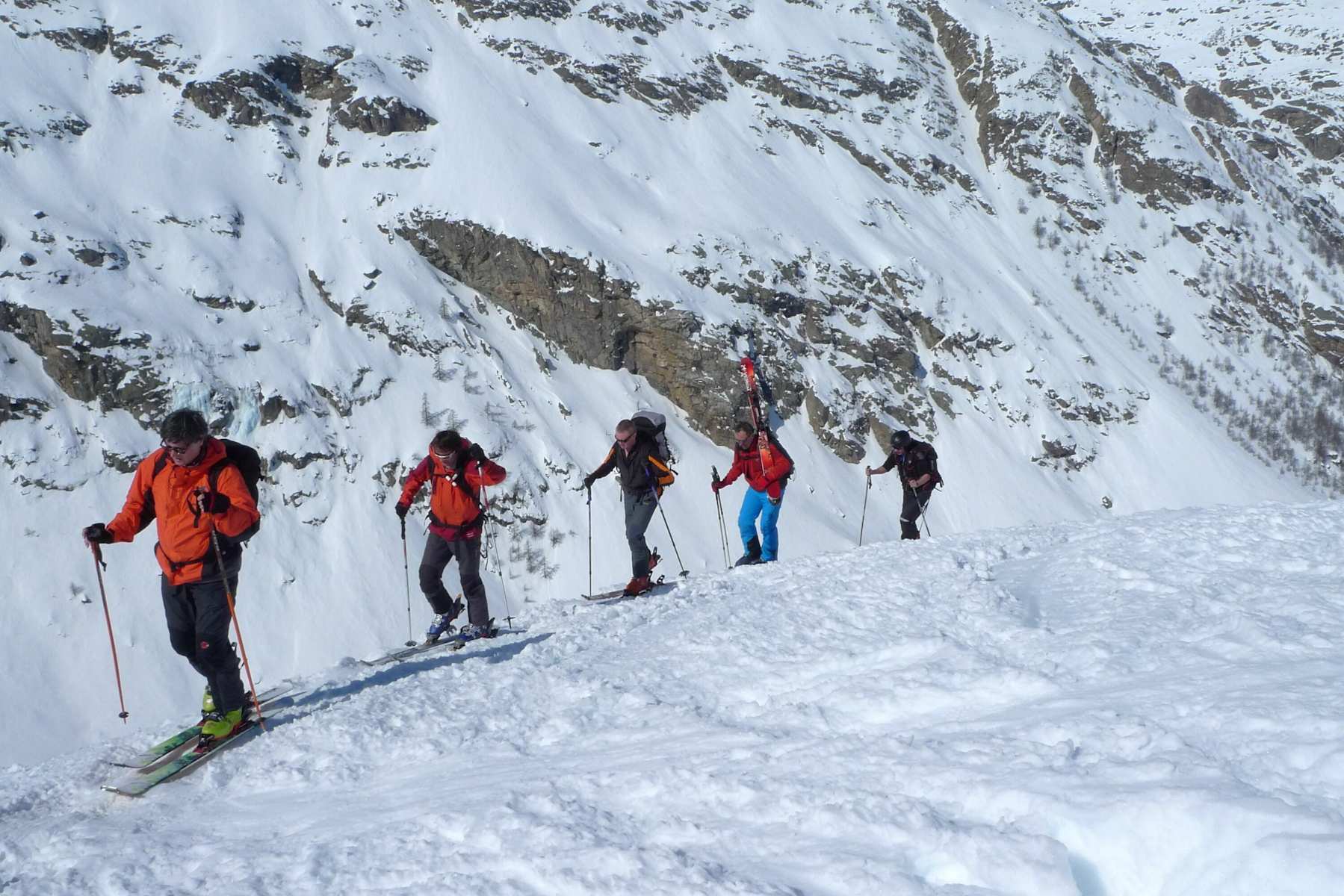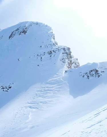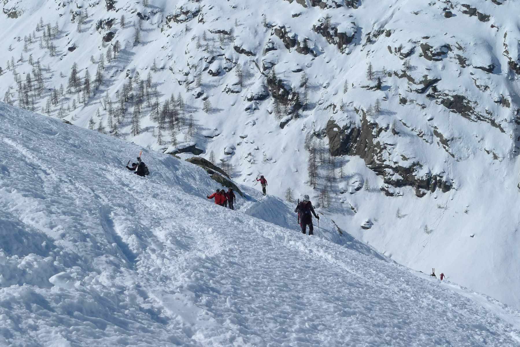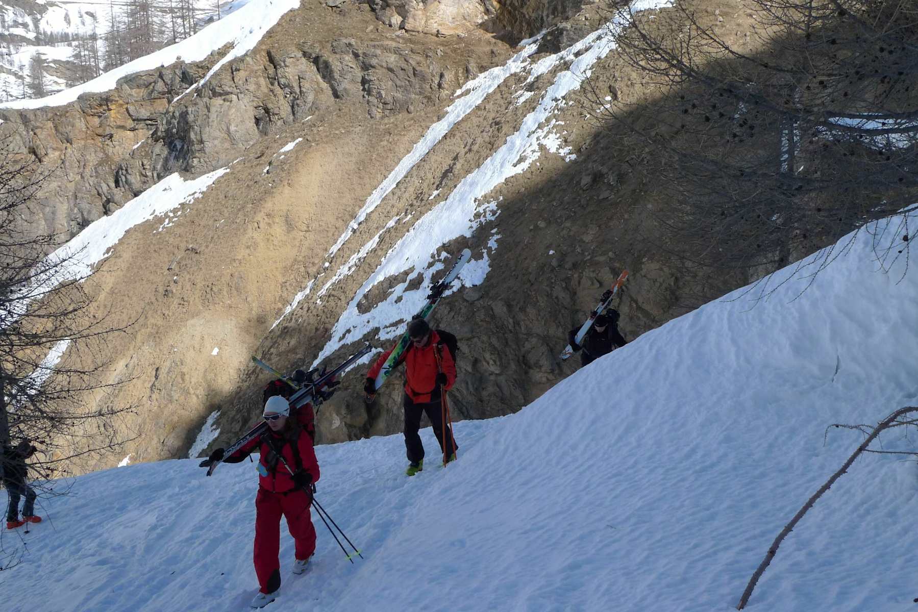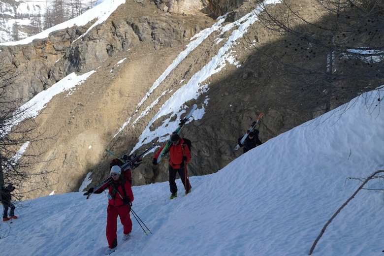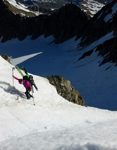 Vor allem bei harten, eisigen Schneeverhältnissen sind Harscheisen, mitunter auch Steigeisen ratsam. Je nach Schneelage ist der untere Teil im Frühjahr oft bereits schneefrei. Ist die Steilstufe überwunden wird‘s flacher und über kupiertes Gelände und über einige sehr kurze Steilstufen mit wenigen Spitzkehren die letzten 250 Hm zur Hütte.