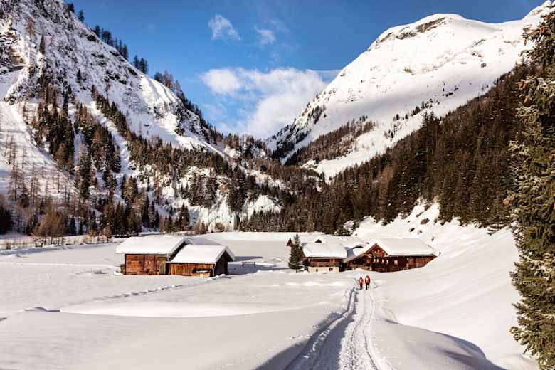 Vom Matreier Tauernhaus folgt man zunächst der Straße hinein ins Gschlößtal. Durch die Wintersperre der Straße ist es in den Wintermonaten sehr ruhig und nach rund 1 h Gehzeit erreicht man die geschlossenen Almen des Innergschlößes.