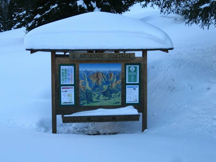Bei der Erzherzog Johann Hütte zweigt die Skitour von der Sölkpassstraße ab und verläuft unterhalb der Hütte direkt am Infopavillon vom Naturpark Sölktäler vorbei. Foto: Volkhard Maier Bildergalerie (6)