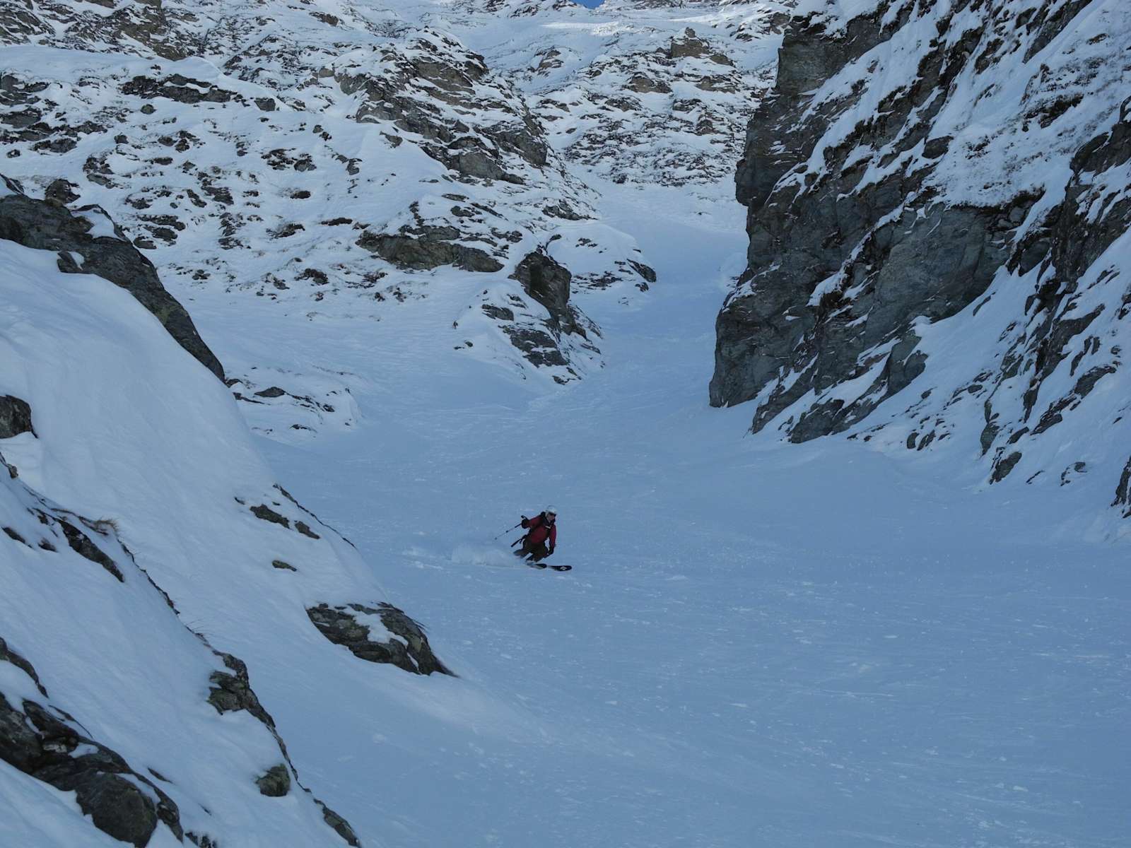 Schlüsselstelle: die gesamte Abfahrt, speziell die Einfahrt in die markante Rinne im unteren Teil