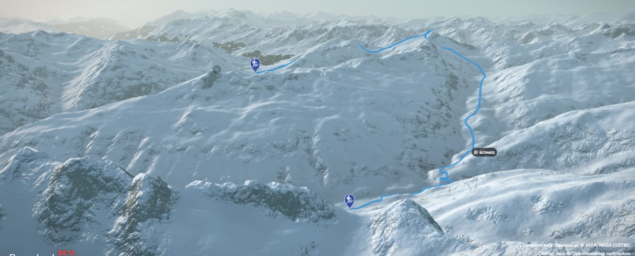 Vom Skidepot in einem weiten Linksbogen zur Lücke auf 2.795 m circa 400 m nördlich des Gipfels. Dann Abfahrt Richtung Westen über die steilen Hänge des Meschitollerbergs bis nach Oberstafel. Ab hier lange, aber leichte Abfahrt auf der verschneiten Witwenwasserenstrasse nach Realp. Von dort mit dem Zug zurück nach Andermatt.