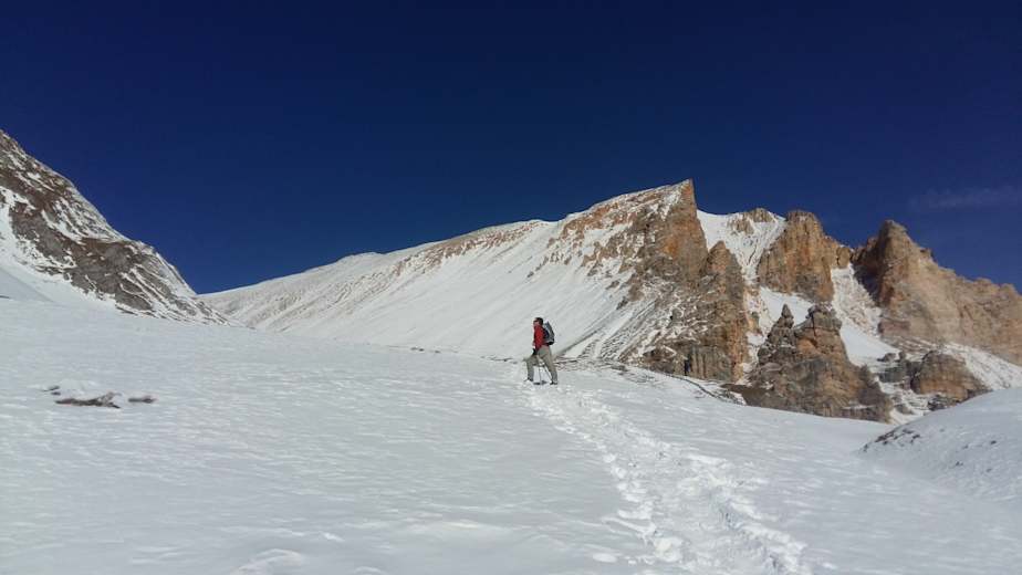 Die Ski lässt man bei den letzten steilen Felsen zurück und geht zu Fuß zum höchsten Punkt.