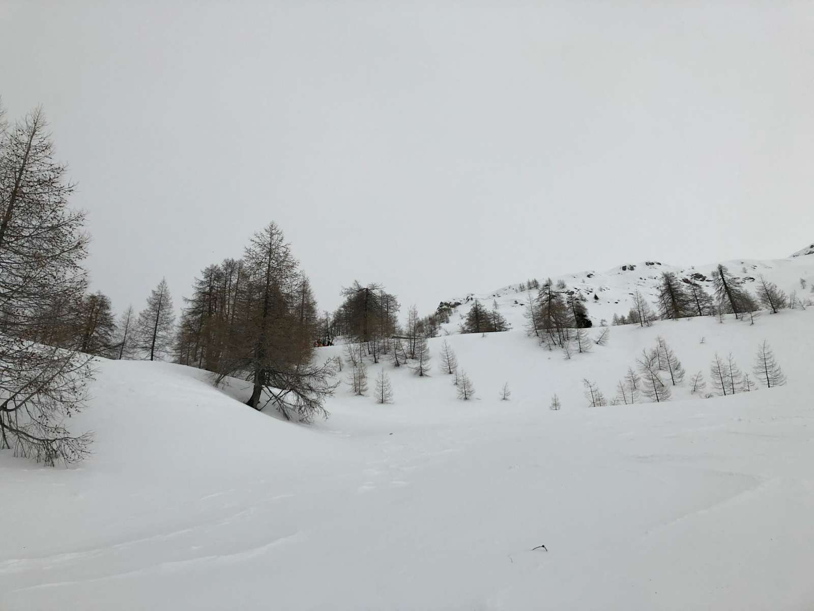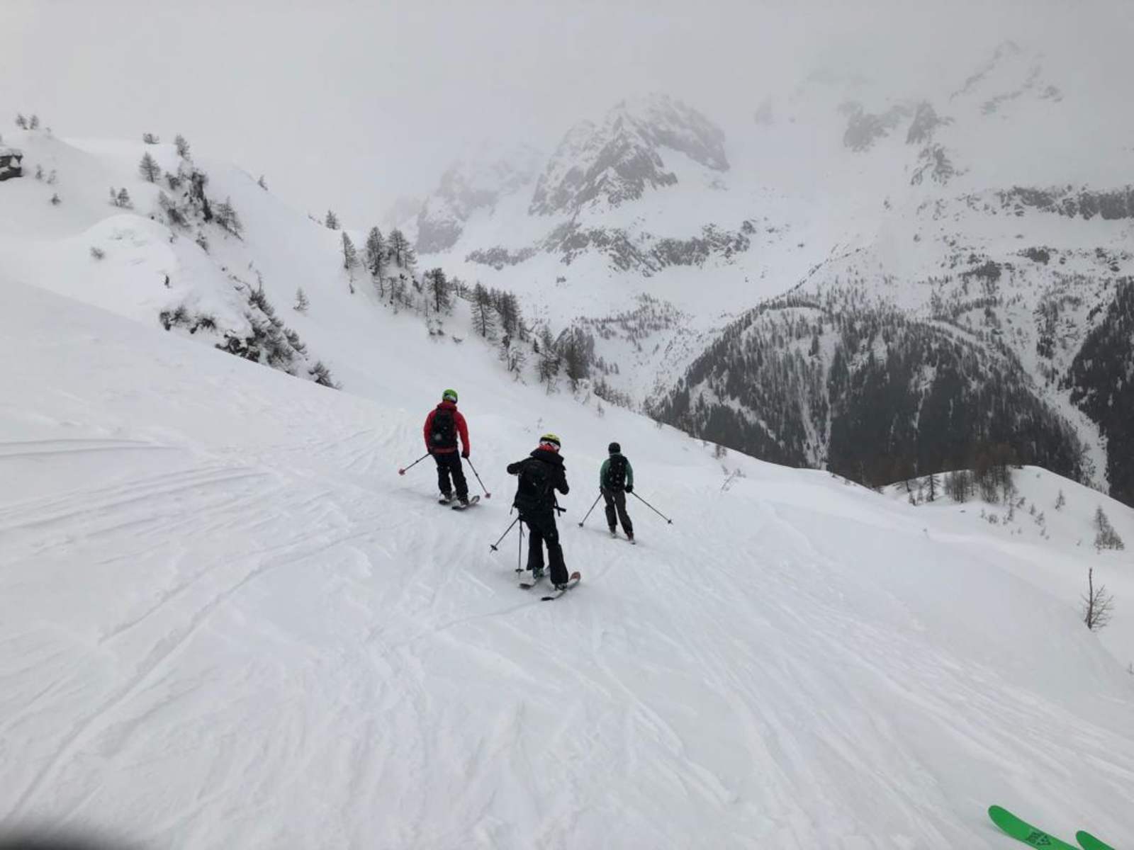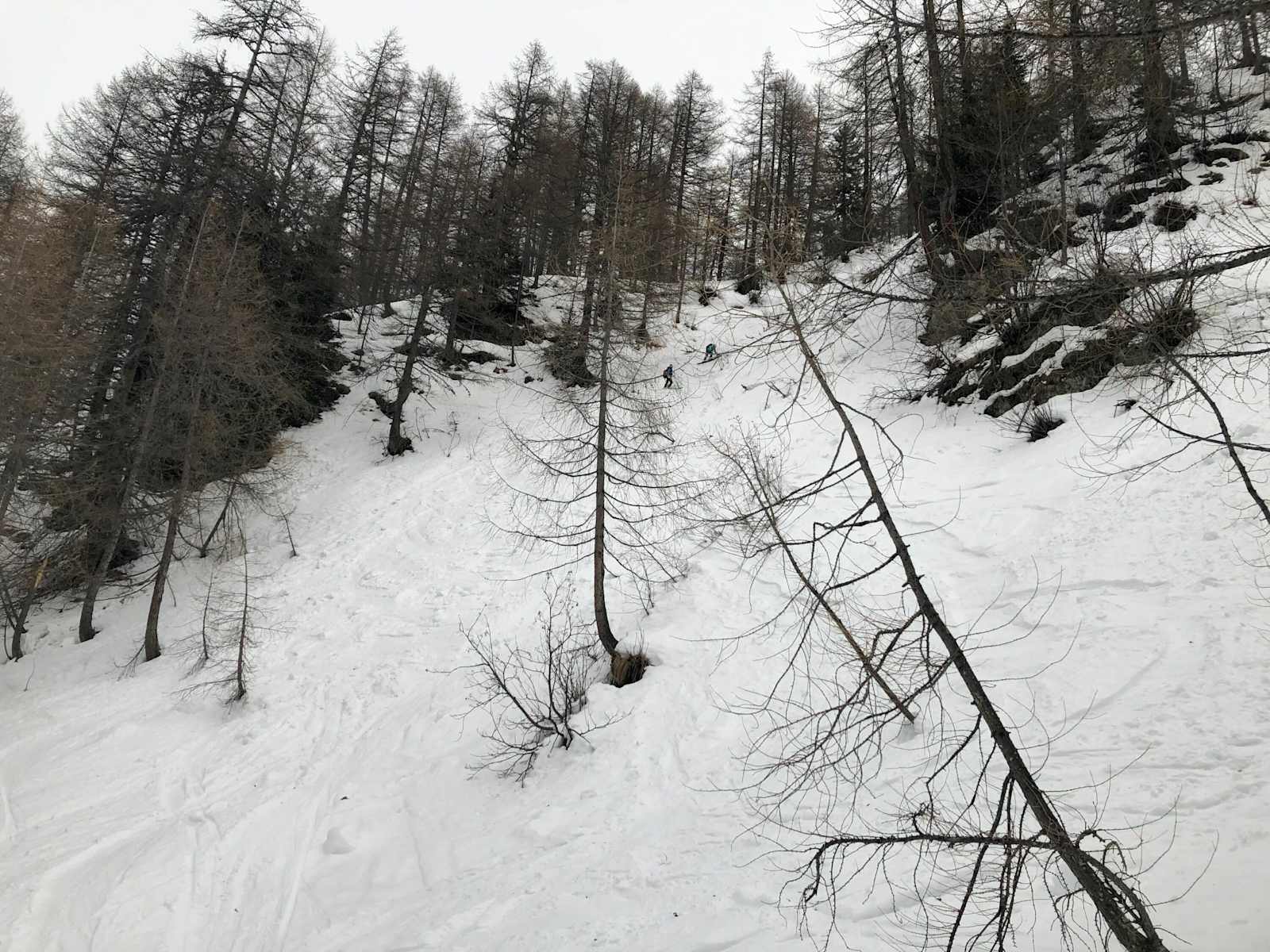Bei sicheren Verhältnissen kann die rasante Abfahrt über die schönen Steilhänge nach Mott fortgesetzt werden.