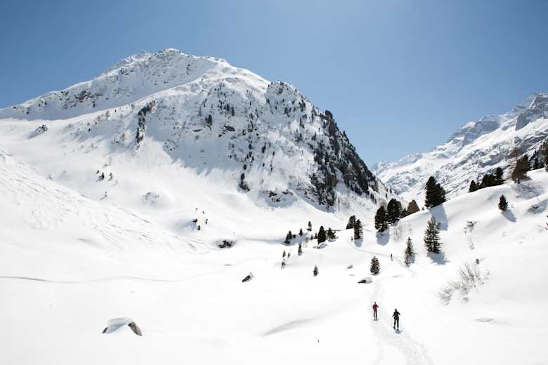 Der winterliche Zustieg zur Fornohütte erfolgt mit Skitourenskiern oder mit Schneeschuhen. Foto: Amadeus Waldner / Bergwelten Magazin