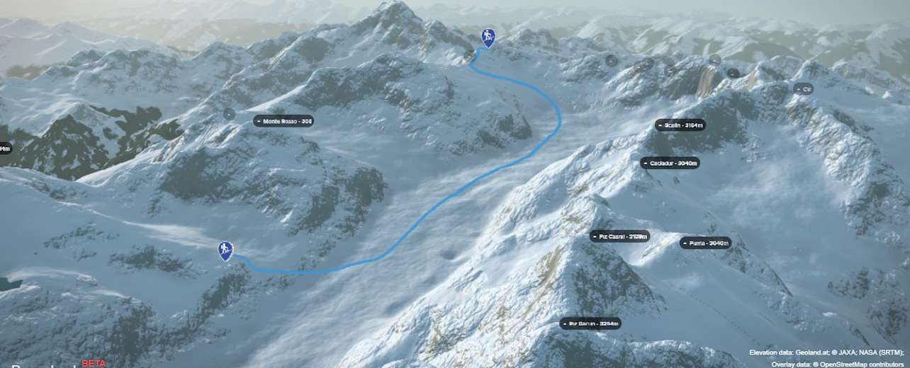 Von der Fornohütte fährt man zunächst kurz auf den Fornogletscher ab. Etwa eine Stunde lang folgt man nun dem mächtigen Gletscher Richtung Süden. Am Ende des Kessels auf etwa 2.700 m dann ostwärts halten und gegen den Passo Sissone (3.150 m) ansteigen.