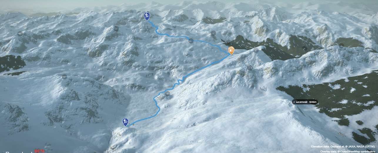 Die Tour startet an der Vordergnadenalm. Entlang der Langlaufpiste geht es etwa 2 km zur Hintergnadenalm. Von dort führt der Weg auf der Rodelbahn mit zahlreichen Abkürzungsmöglichkeiten zur Südwiener Hütte (1.802 m).
