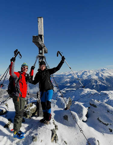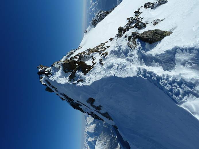 Bei optimaler Schneelage kann man kurz ein weiteres Stück links am steilen Rücken mit Ski aufsteigen. Dort legt man dann ein Skidepot an. Zu Fuß steigt man über den Gipfelgrat bis zum höchsten Punkt.