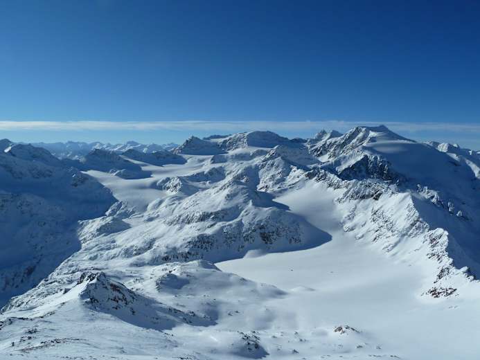 Das weitläufige Gelände ab dem unteren Ende des Feuersteinferners lässt viele schöne Varianten für die Abfahrt zu.