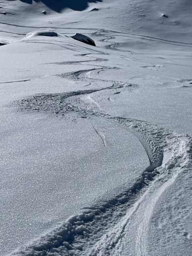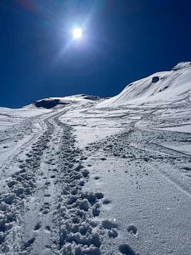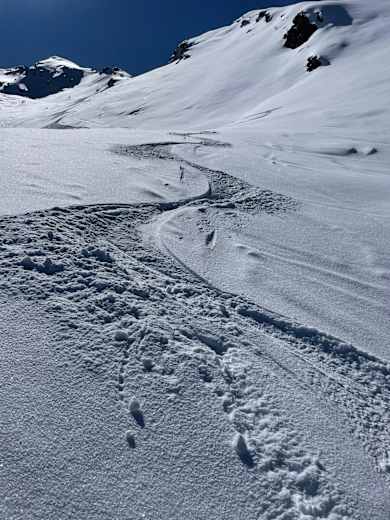Hier öffnet sich die Landschaft und die Spur zieht man hier durch schönstes Skigelände. Man geht nun in südwestliche Richtung, nicht allzu steil auf einen markanten Rücken zu, der von Norden zum Saxner führt (rechts davon ist einen kleine Kuppe mit einem Kreuz).