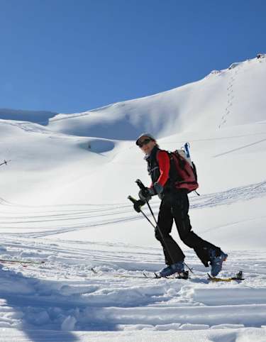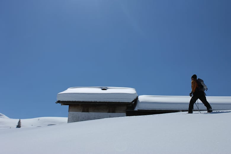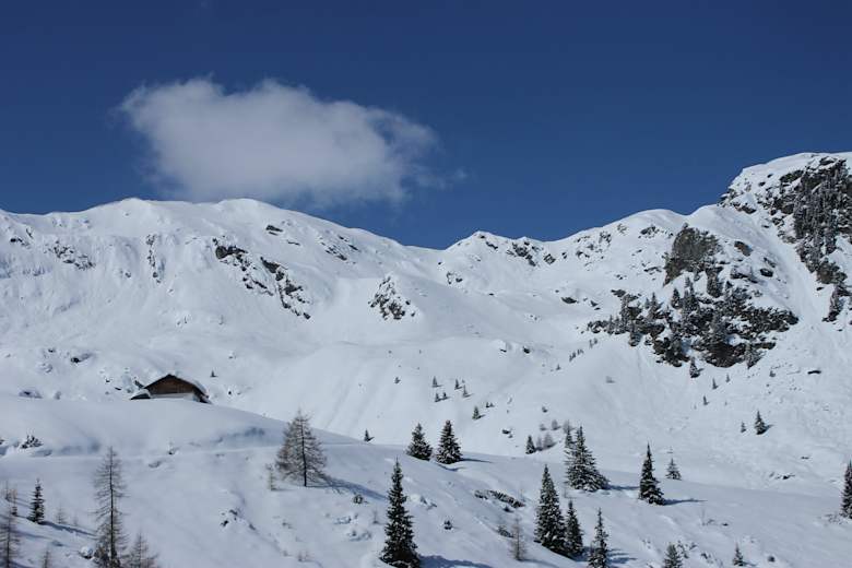 Bei der Abfahrt kann man dann zwischen sanften und steilen Varianten wählen. Deshalb eignet sich diese Tour besonders gut für Skitouren-EinsteigerInnen.