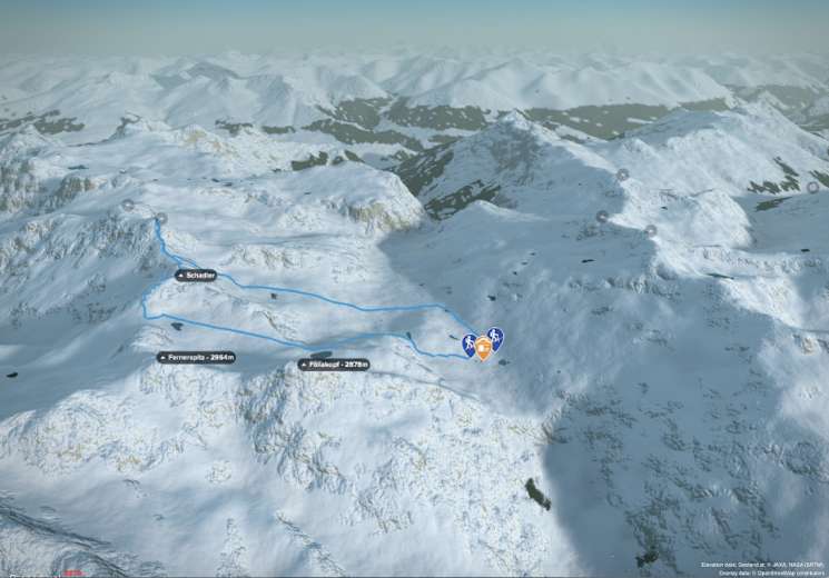Abfahrt: Bei absolut sicheren Verhältnissen wird häufig über die steile Ostflanke abgefahren (Einstieg vom Rücken zwischen Schadler und Piz Rims) und man kommt nach Osten auf die Aufstiegsspur von der Sesvennahütte.