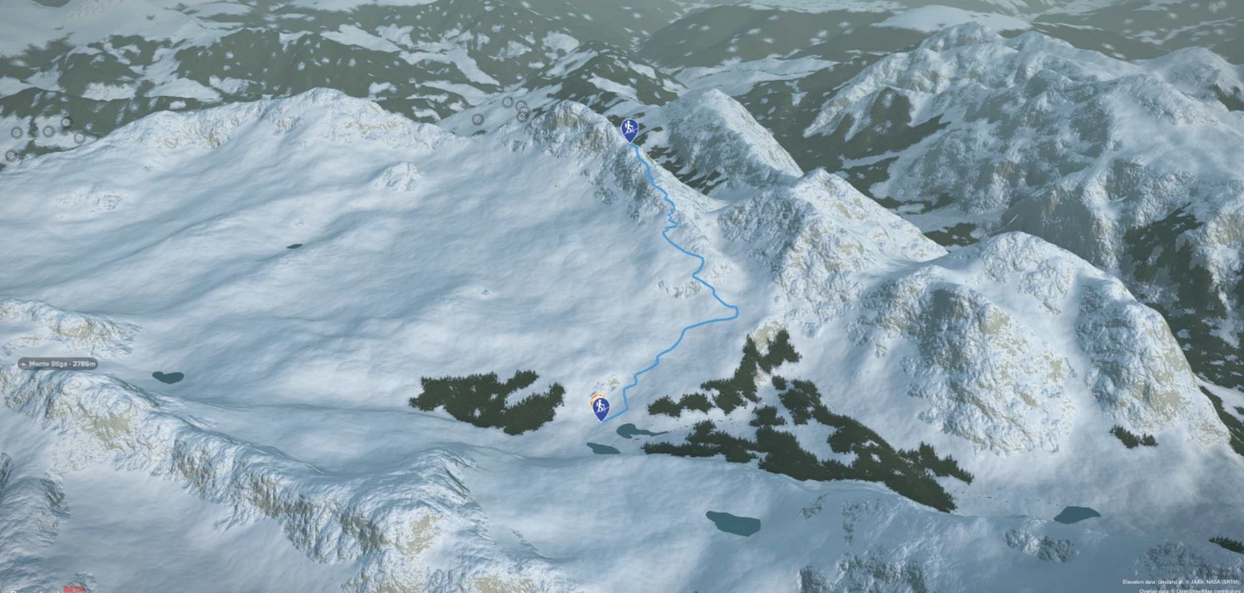 Der Übergang zum Hauptgipfel, erfolgt über einen sehr schmalen und ausgesetzten Gipfelgrat (Klettersteig - Drahtseile meist eingeschneit), der im Winter kaum begangen wird und für die Skitour nicht lohnend ist.