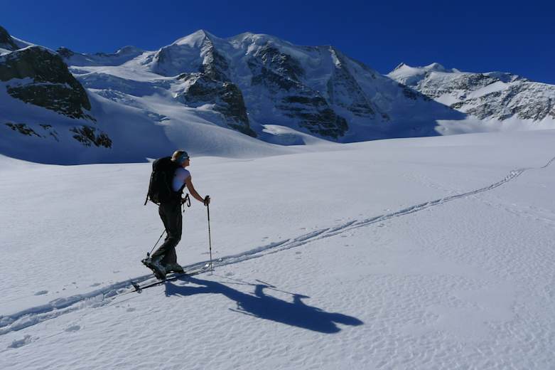 Von der Diavolezza Bergstation fährt man zunächst ein kurzes Stück über die Piste ab. Dann traversiert man unterhalb des Piz Trovat hinab auf den flachen Persgletscher, wo die Felle angelegt werden. Flach überquert man den Gletscher am Fusse des Piz Palü vorbei Richtung Westen bis das Gelände ansteigt.