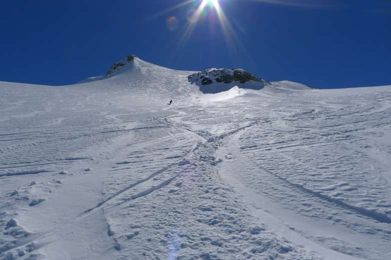 In zahlreichen Spitzkehren erreicht man über zwei Stufen den Sattel zum Fortezza Gletscher. Hier wendet man sich Richtung Westen und erreicht die Steilstufe nördlich umgehend P 3185.