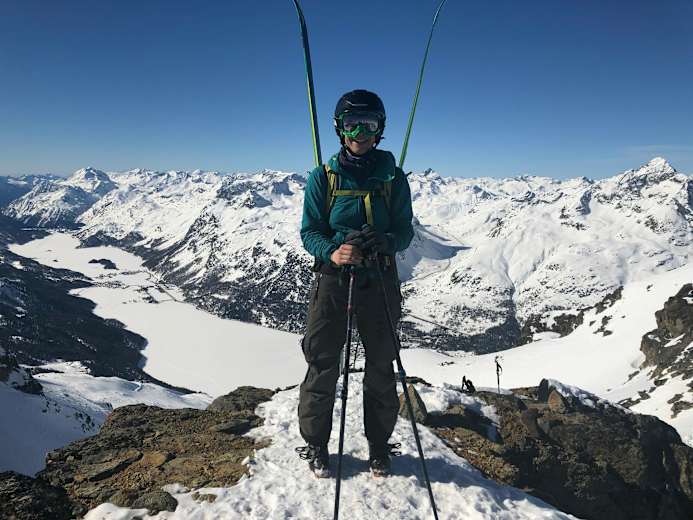 Am Gipfel des Piz San Gian - Aussicht auf die verschneiten Engadiner Seen Foto: Claudia Timm