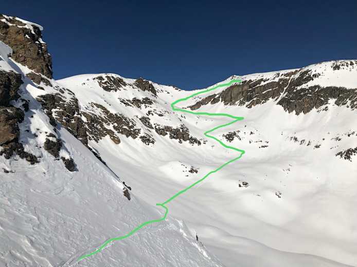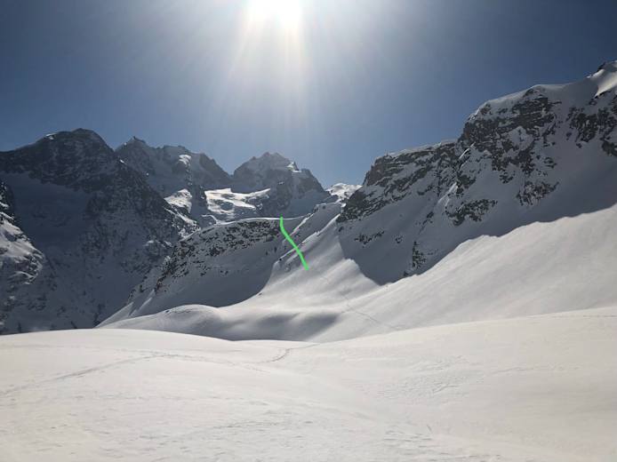 Abfahrt über den steilen Gipfelhang auf den Vadret da Rosatsch. Dabei sind einige Felsbänder zu umfahren. Sobald der Gletscher erreicht ist hält man sich Richtung Nordwest und hält auf P. 2758 zu. Die Felsbänder auf 2.700 m rechts umfahrend gelangt man in ein breites Couloir, dem man Richtung Munt San Gian folgt. Wenig später erreicht man die Piste der Signalbahn und fährt auf dieser ab nach St. Moritz Bad. Mit dem Bus geht es zurück zur Corvatsch Talstation.