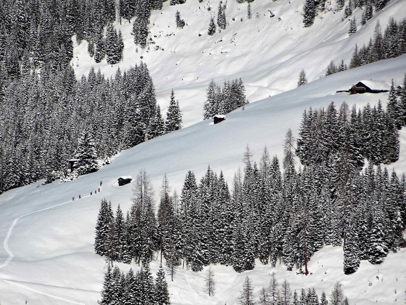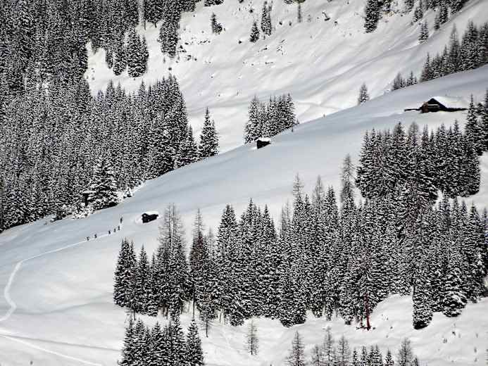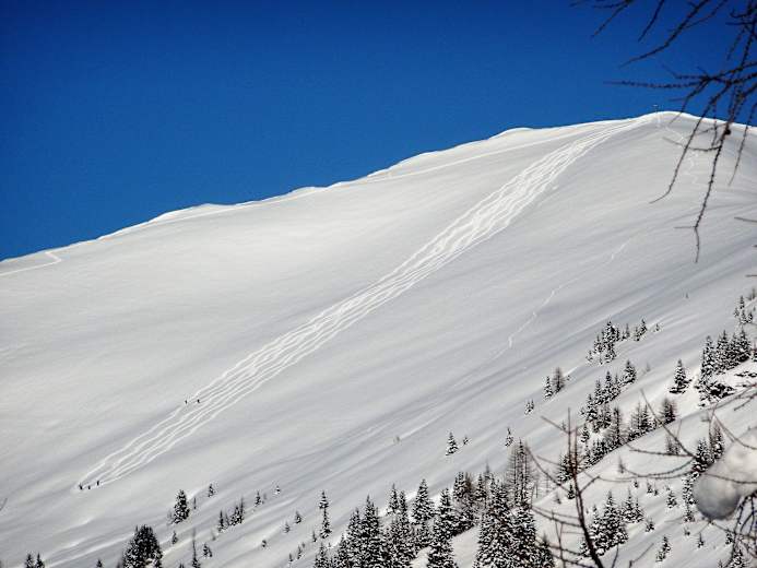 Abfahrt:Entlang der Aufstiegsspur zur Ellmaualm oder, bei sicherer Schneelage, in der Falllinie vom Gipfel Ellmau-Heimalm. Das letzte Stück fährt man am besten nach der Aufstiegspur entlang des Wanderweges.