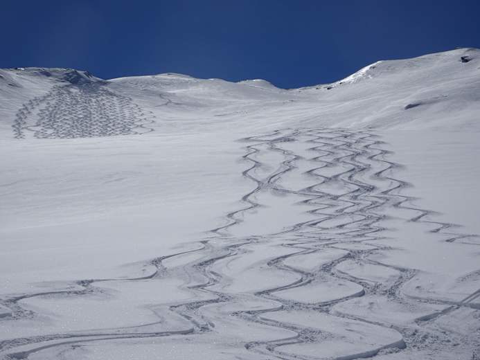 Im Bereich der Aufstiegsroute gibt es verschiedene herrliche Abfahrtsmöglichkeiten, am Ende des Kreekars aber achten, dass man wegen der Querung des Hasecksgrabens auf die Aufstiegsspur zurückkehrt. Das letzte Stück je nach Schneelage auf dem Kreealm-Güterweg oder direkt über den Stockhamberg zum Talboden.