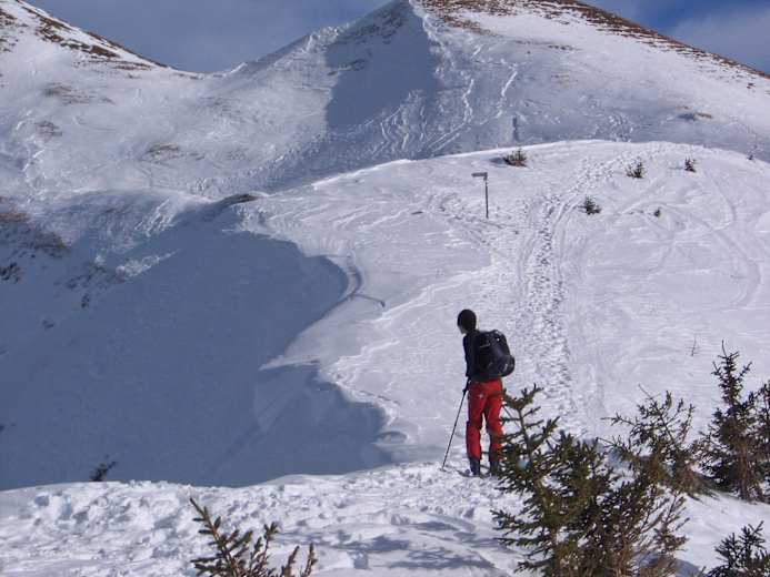 Am besten folgt man dem Weg nach links und recht frei über freie Hänge hinauf bis zum Häfnerjoch. Von da an über den Grat (Vorsicht Wächten!) einfach zum Gipfel der Üntschenspitze (2.135 m).