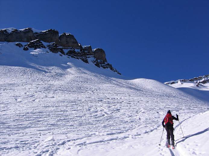 De direkte Nordabfahrt ist nur bei sehr sicheren Schnee- und Sichtverhältnissen zu wagen. Die richtige Wahl der Linie ist von oben schwer einzusehen und deshalb Kennern der Route vorbehalten, ansonsten kann es zu bösen Überraschungen (Wasserfall, Wandabbruch) kommen!