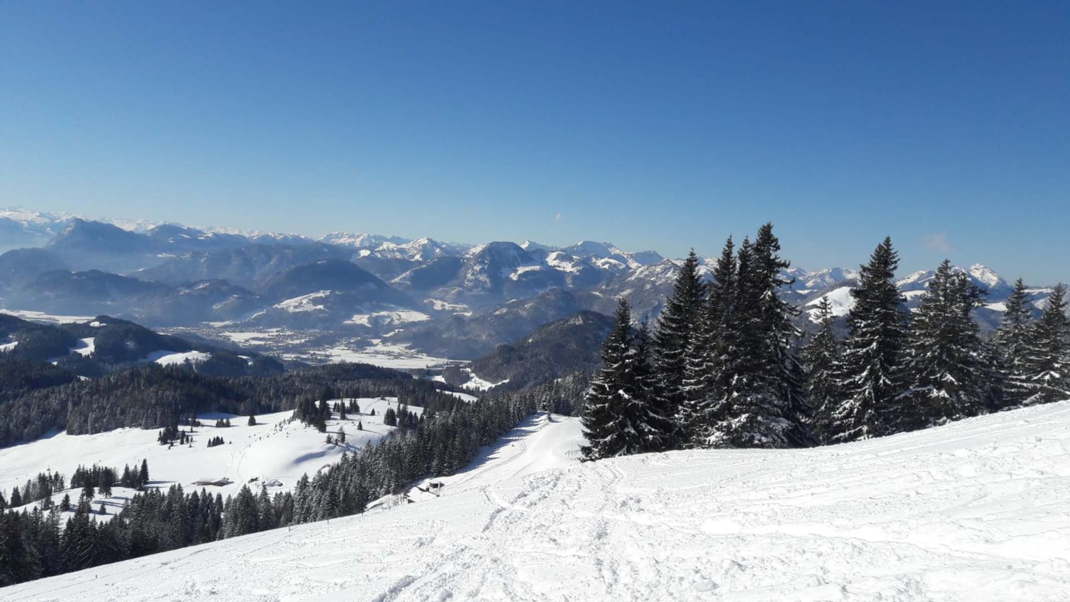 Für die Abfahrt hält man sich im Abfahrtssinne etwas weiter rechts und schwingt über freie Hänge hinunter zum Spitzsteinhaus. Man fährt weiter bis zur Höhe der Goglsalm und schwingt über den schönen freien Hang unterhalb hinab. Am Ende hält man sich scharf links um zur Aufstiegsspur zu queren. Entlang von dieser fährt man hinunter zum Parkplatz bei Sachrang.