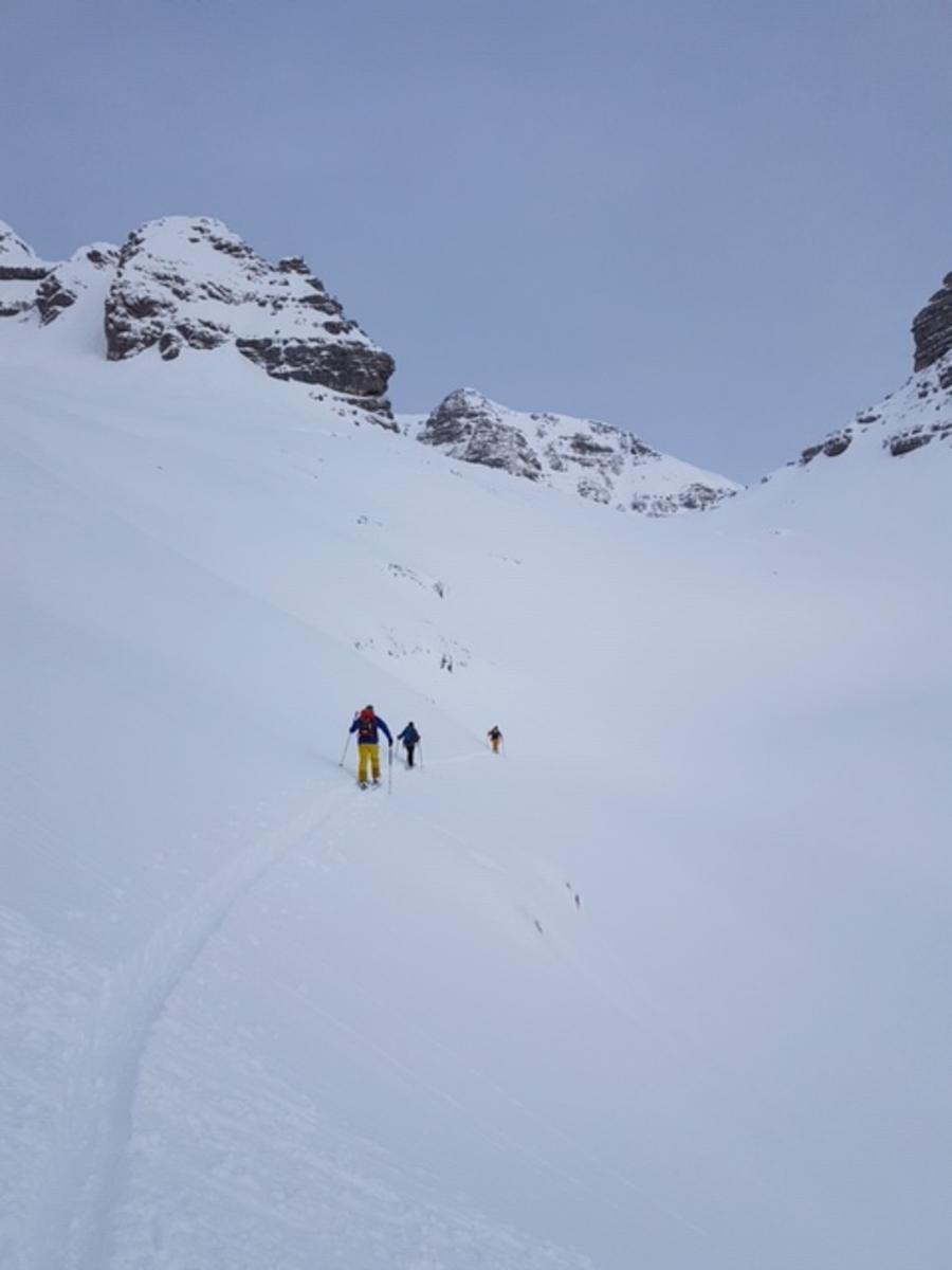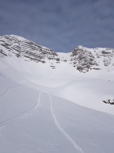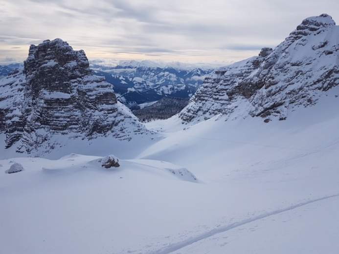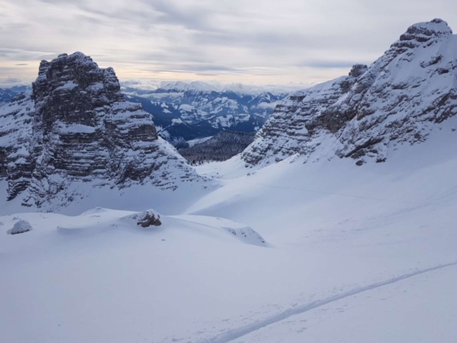Entlang der Aufstiegsspur: Die Schlüsselstelle im Skilehrerweg kann aufgrund von Schneeverhältnissen nicht oft befahren werden. Wieter über die Aufstiegsspur zurück zur Piste und Abfahrt ins Skigebiet.