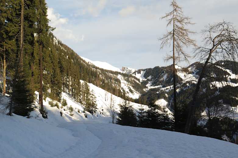 Die erste Forststraße queren und der zweiten Forststraße nach Nordwesten folgen. Auf 1.500 m links (westlich) in den Wald abbiegen,dann gelangt man zur Aiplhütte (1.700 m). Weiter in westlicher Richtung gehen und durch lichten Lärchenwald über das Hochplateau.Nun über das Plateau geradeaus weiter – immer stets nach Westen über kupiertes Gelände.