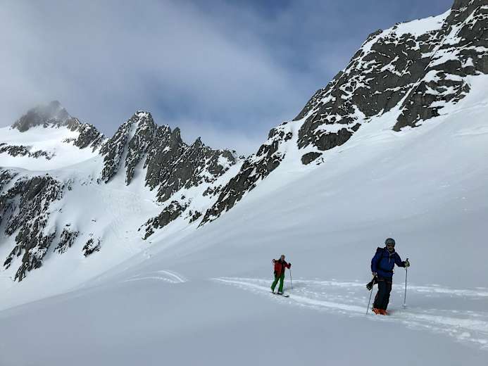 Von hier bis zum Brunnigletscher je nach Verhältnissen absteigen oder abfahren und unproblematisch auf dem Brunnifirn mit leichtem Abstand zum Gletscherrand entlang der Felskette die Fahrt fortsetzen (nach Osten, bis auf 2.660 m). Man passiert den Piz Acletta (2.911 m, zu unserer rechten Seite), kurz danach erfolgt ein kurzer Aufstieg zum Brunnipass (2.720 m).