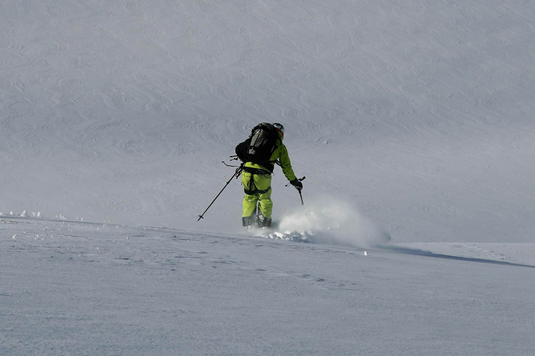 Auf der anderen Seite gehen die ersten 100 m steil hinab, danach fährt man über den endlos weiten Sulztalferner zur Amberger Hütte. Aufgepasst auf die Gletscherspalten!