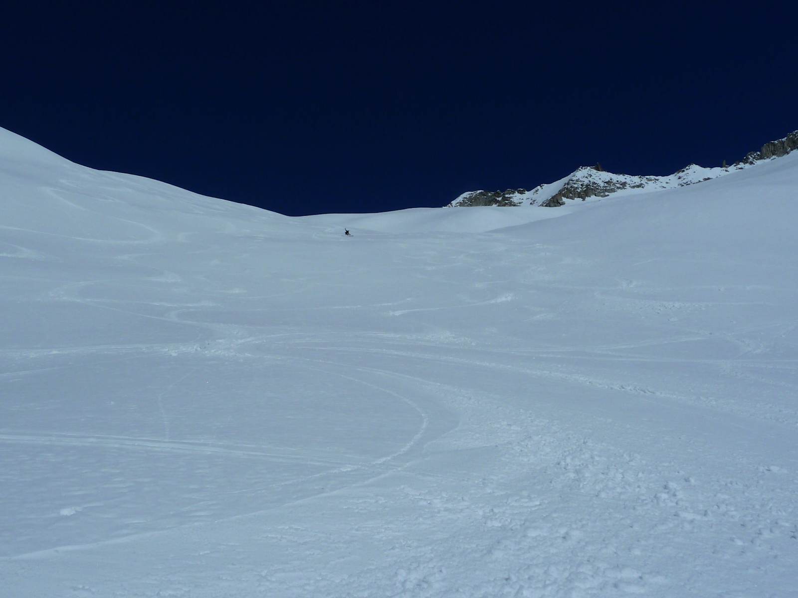 Danach fährt man auf dem Gletscher Richtung Reichenspitze ein Stück weit ab, bevor der Gipfelanstieg beginnt. Das Gelände wird immer steiler, bis man schließlich rund 100 m vor dem Gipfel das Skidepot errichtet und - je nach Bedingungen - die letzten Meter zum Gipfel stapft.