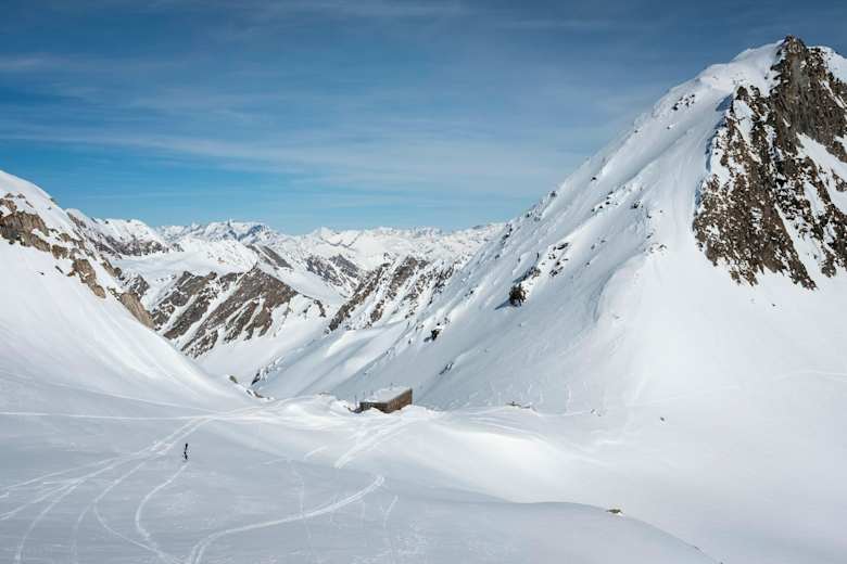 Dann Abfahrt auf dem Aufstiegsweg bis kurz vor die Hütte. Dort fellt man wieder an und steigt circa 100 Hm zum Passo Gararesc (2.693 m) auf. Von dort Abfahrt durch den breiten Kessel Richtung P. 2355. Nochmal kurz anfellen und kurz zu P. 2513 aufsteigen. Von dort führt die genussvolle Abfahrt durch das idyllische Val Casinello nach Folcra di Mezzo. Dort Richtung Südwest halten und über die Alpe di Valleggia (1.751 m) hinab nach Ronco.