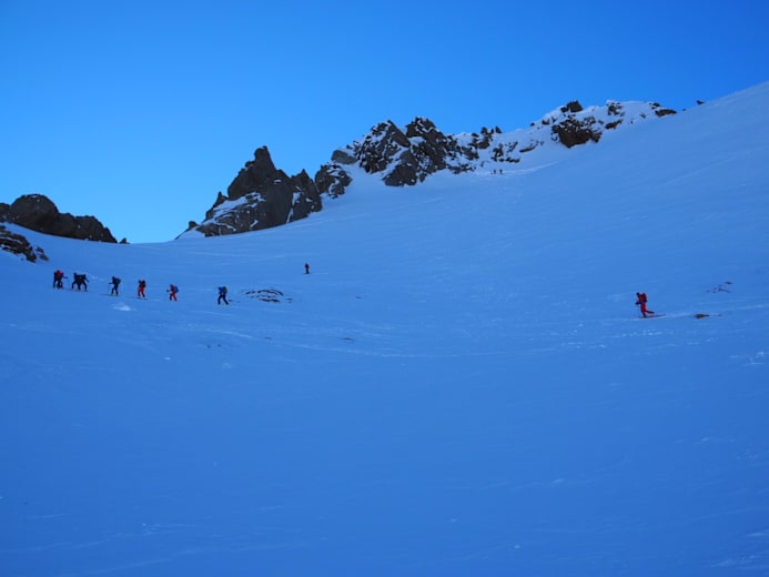 Nach einer kurzen Abfahrt zum oberen Kaltenbergseee (2.350 m) beginnt der imposante Aufstieg am Gipfelhang des Kaltenbergs. Dabei steigt man diesen Nordhang immer steiler werdend bis knapp unter die Spitze, errichtet dort ein Skidepot und steigt mit einem angebrachten Seil zum felsigen Gipfel auf 2.896 m hoch.