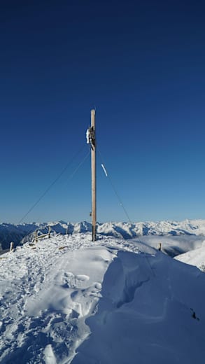Von Meransen führt eine abwechslungsreiche Spur größtenteils abseits der Pisten bis hinauf zum mächtigen Gipfelkreuz des Gitschbergs. Skitour mit Ausblick auf die Gipfelkette der Zillertaler Alpen in Südtirol.