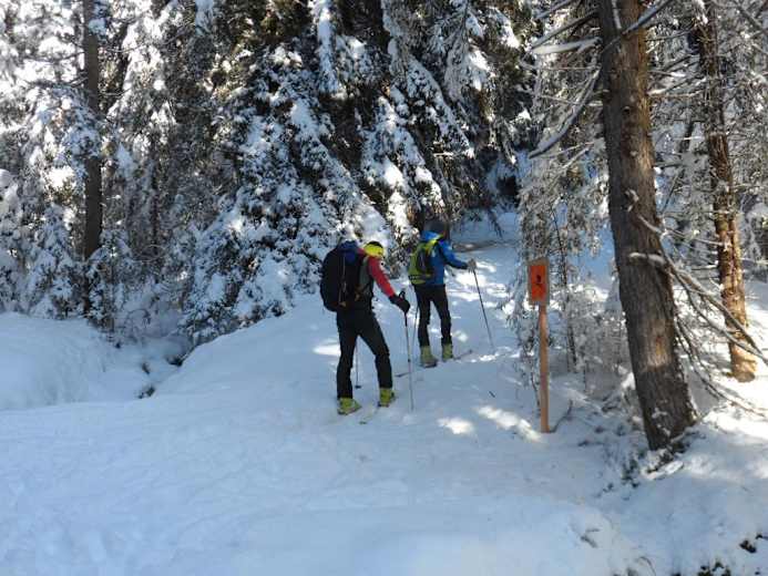Vom Parkplatz geht man, die Skier schulternd, über eine Zufahrtsstraße in 5 Minuten bis zu einem auffallenden Rundbau, um hier bald die Skier anzuschnallen. Nach weiteren 5 Minuten ist rechts abzuzweigen. Man trifft auf eine Rodelbahn, der man 100 Meter, sich streng rechts haltend entlang geht, bzw. überquert, um in einen mittelmässig steilen Weg einzumünden.