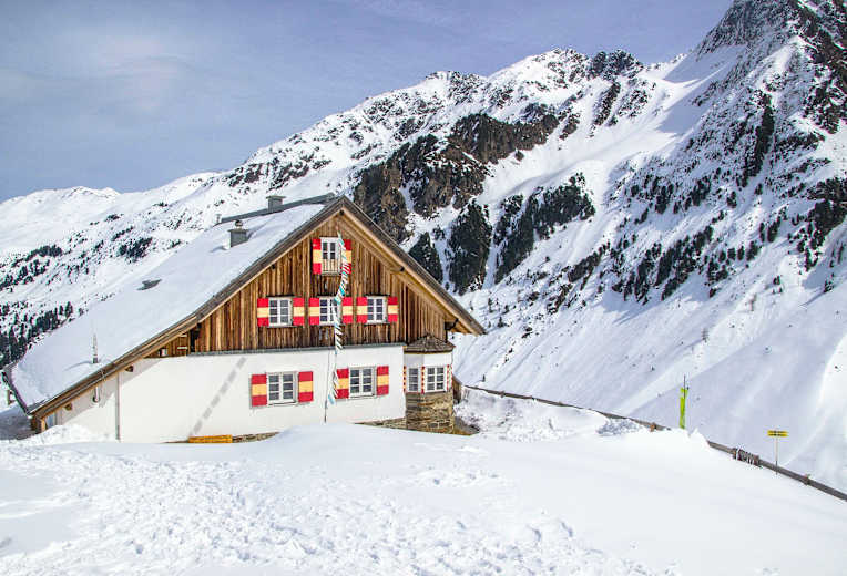 Die Potsdamer Hütte liegt auf 2.020 m im Fotschertal - einem Seitental des Tiroler Sellraintales. Der Skitourenanstieg erfolgt entlang des Baches - Rodelbahn - bis kurz vor das Bergheim Fotsch.