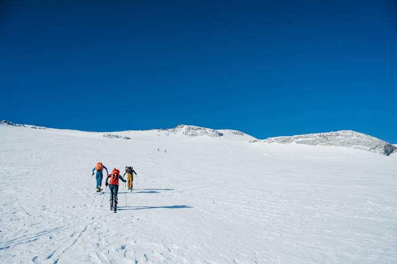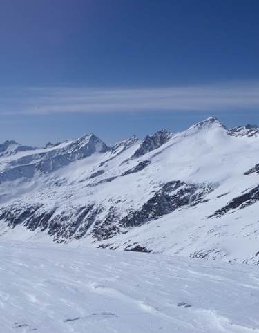 Man steigt nun über den moderat steilen, weiten und nicht allzu spaltigen Gletscher weiter nach Westen und peilt den Durchschlupf zwischen einer markanten Felsinsel und dem Gipfelaufbau an. Nach Bewältigung des Durchschlupfs schwenkt man auf etwa 3.200 m Seehöhe nach Südwesten und steigt über steile Hänge bis zum Ostkamm und zum Skidepot. Nun über steilen Schnee bzw. Felsblöcke entlang des luftigen Grates auf den Vorgipfel und ausgesetzt fast waagrecht hinüber zum Gipfelkreuz (oft Steigeisen notwendig).