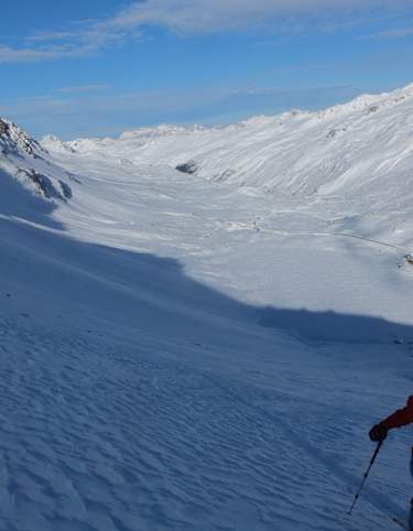 Speziell bei Firnbedingungen ist die Westflanke der Murmentenkarspitze besonders lohnend. Ein Stück unterhalb der Mulde orientiert man sich dann gegen Westen und hat noch einen traumhaften Hang hinunter zur Hinteren Wenner Alm. Zum Schluss entlang der Aufstiegsspur retour zum Ausgangspunkt.