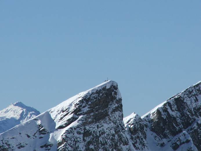 Den steilen Gipfelhang „überlistet“ man am besten, indem man links bis fast zur Scharte aufsteigt und dann rechts haltend zum Gipfel quert (Vorsicht Wechten nach Norden!).