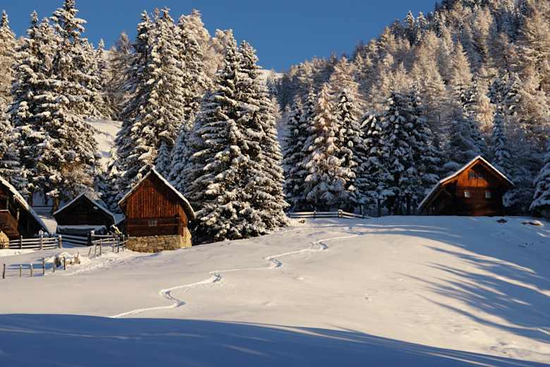 Vom kleinen Parkplatz ein paar Meter zurück auf die Zufahrtsstraße zur Christebauerhütte und dieser – bei der ersten Abzweigung der linken Kehre folgend – aufwärts bis zu den freien Flächen unterhalb der Christebauerhütte (1.600 m, ca. 1 Std., bei viel Schnee gibt es alternativ vom Parkplatz weg eine Spur nach Westen, die über einen Hohlweg weiter oben die Forststraße erreicht).