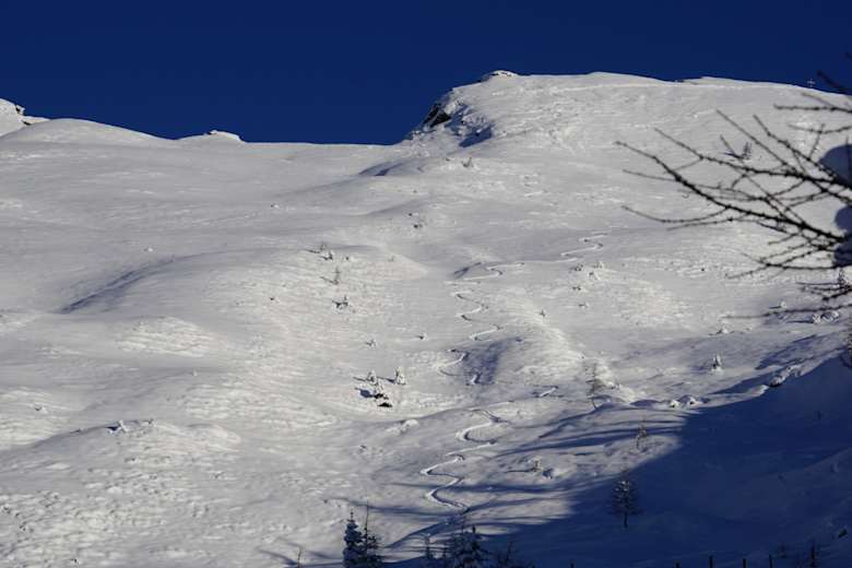 Entlang der Aufstiegsspur, bei sicheren Verhältnissen auch direkt über den steilen Gipfelhang.