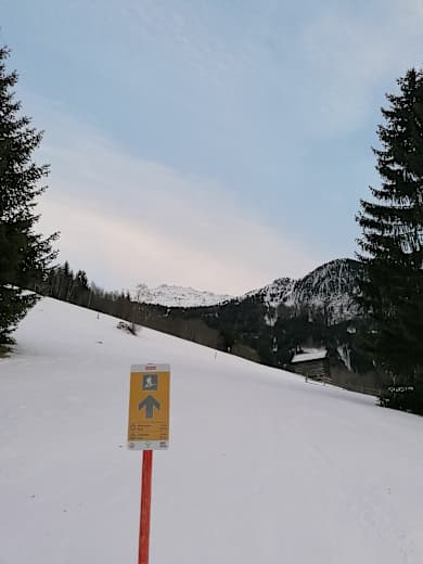 Nach dem Start einem recht flachen Weg folgen und den freien Hang vor dem Lisslift (Tellerlift) in wenigen Serpentinen aufsteigen. Anschließend wieder auf einem Weg bis zu einem breiten Hang knapp vor der Hochzeiger Gondelbahn. Diesem Hang und den freien Lichtungen bis zum Hochzeiger Haus folgen.