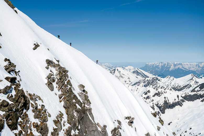 Hier setzt nun ein etwa 35 Grad steiler Osthang an, über den man das kleine Kar, flacheres Kar unter dem Gipfel, erreicht. Je nach Schneeverhältnissen, meist aber im südlichen Bereich des Kars, steigt man über die kurze, steile Wandstufe des Kars auf und erreicht so den Südostgrat. Hier kann man das Skidepot errichten. Über den teils verblockten Grat (ab und zu kurze Drahtseile) steigt man nun zum Gipfel auf.