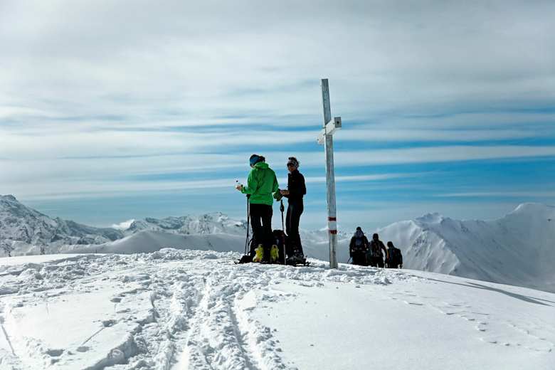 Die Abfahrt auf dem Anstiegsweg führt beim erwähnten Jochkreuz bei sicheren Verhältnissen unmittelbar durch eine herrliche Mulde zur Anstiegsspur, die man dann bis zur ehemaligen Naviser Hütte verfolgt. Ab der Hütte links zur Schneise und in recht direkter Linie hinab zum Parkplatz.